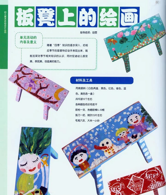 四本书稿中,手工制作共收纳了布艺、木料、胶片、铁艺、塑料、泡沫等多种材料的制作;纸艺篇虽然只用到了纸作为表现的媒介,但其制作的手段也非常多,如:剪纸、折纸、贴纸、撕纸、卷纸、纸艺造型等;传统意义上的绘画只会教小朋友们将所想所看画在纸质上,而绘画篇里,老师们创新不断,让孩子们画在T恤、灯笼、胶片、书包、板凳、鞋子、手和脸、木头、自行车、酒瓶、石膏、陶罐、水杯、乒乓球等材质上,其想法新颖且有独创性;综合篇容纳了各种综合材料的美术制作,制作手段均区别于其他三本,如:雕塑、雕刻、稻草编织、泥塑等,而题材方面更注重了较受欢迎的环保与动物保护题材。